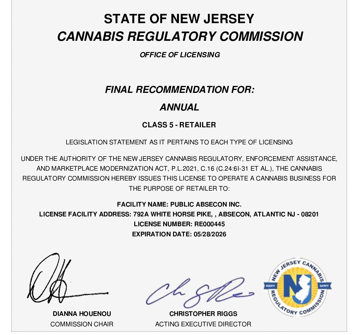 Legal Dispensary in South Jersey. Cannabis Retailer License Issued by the State of New Jersey.